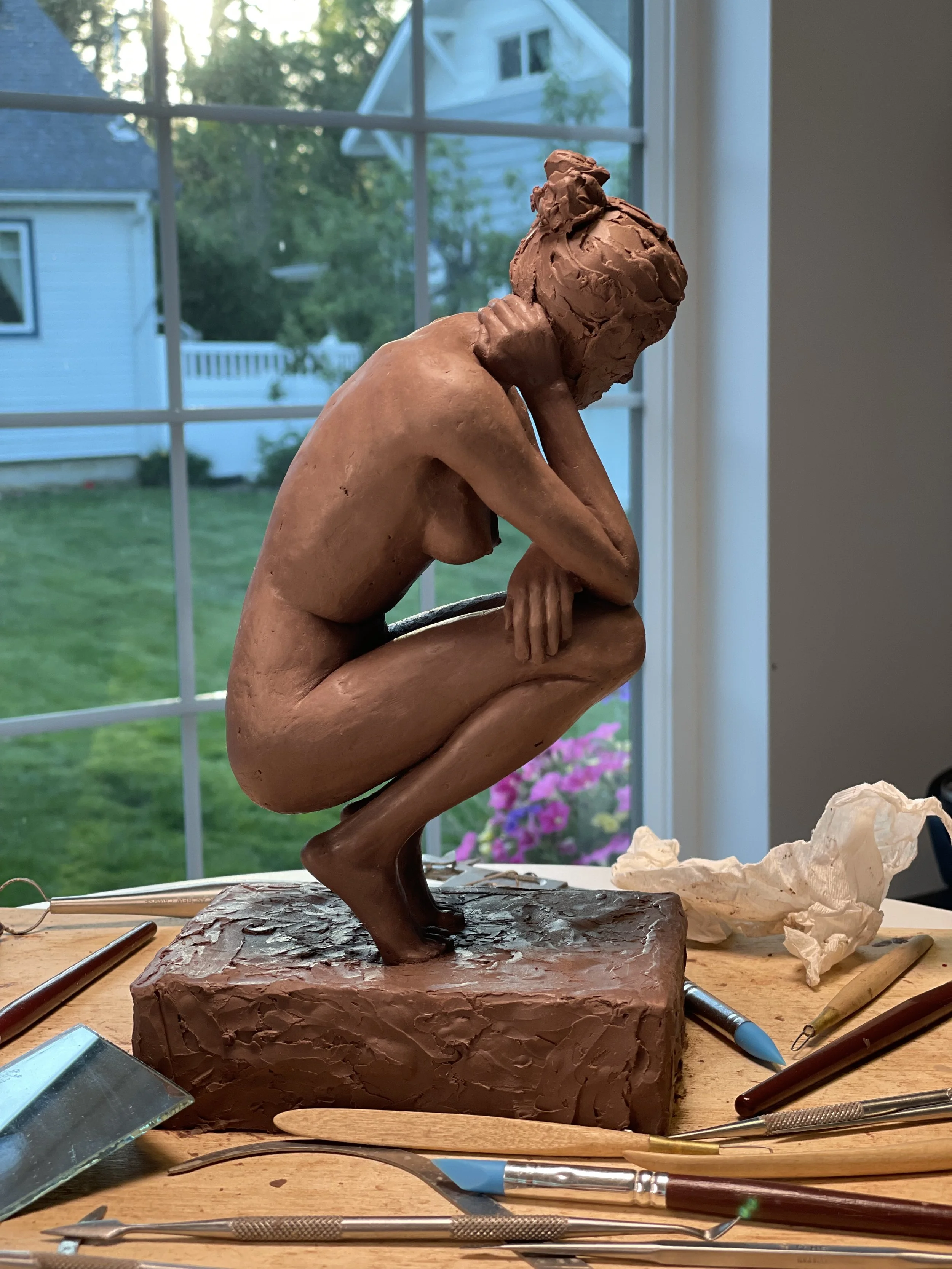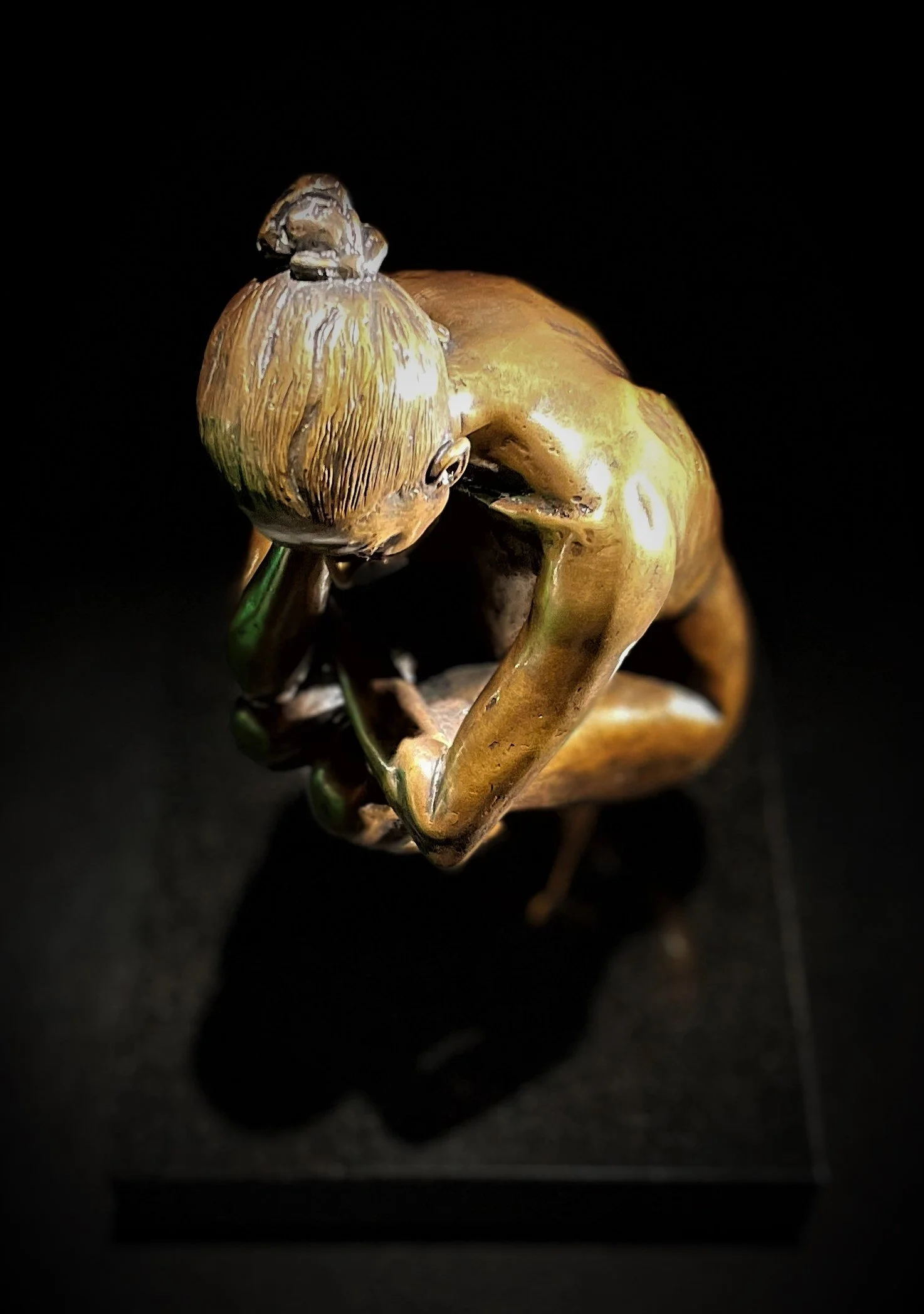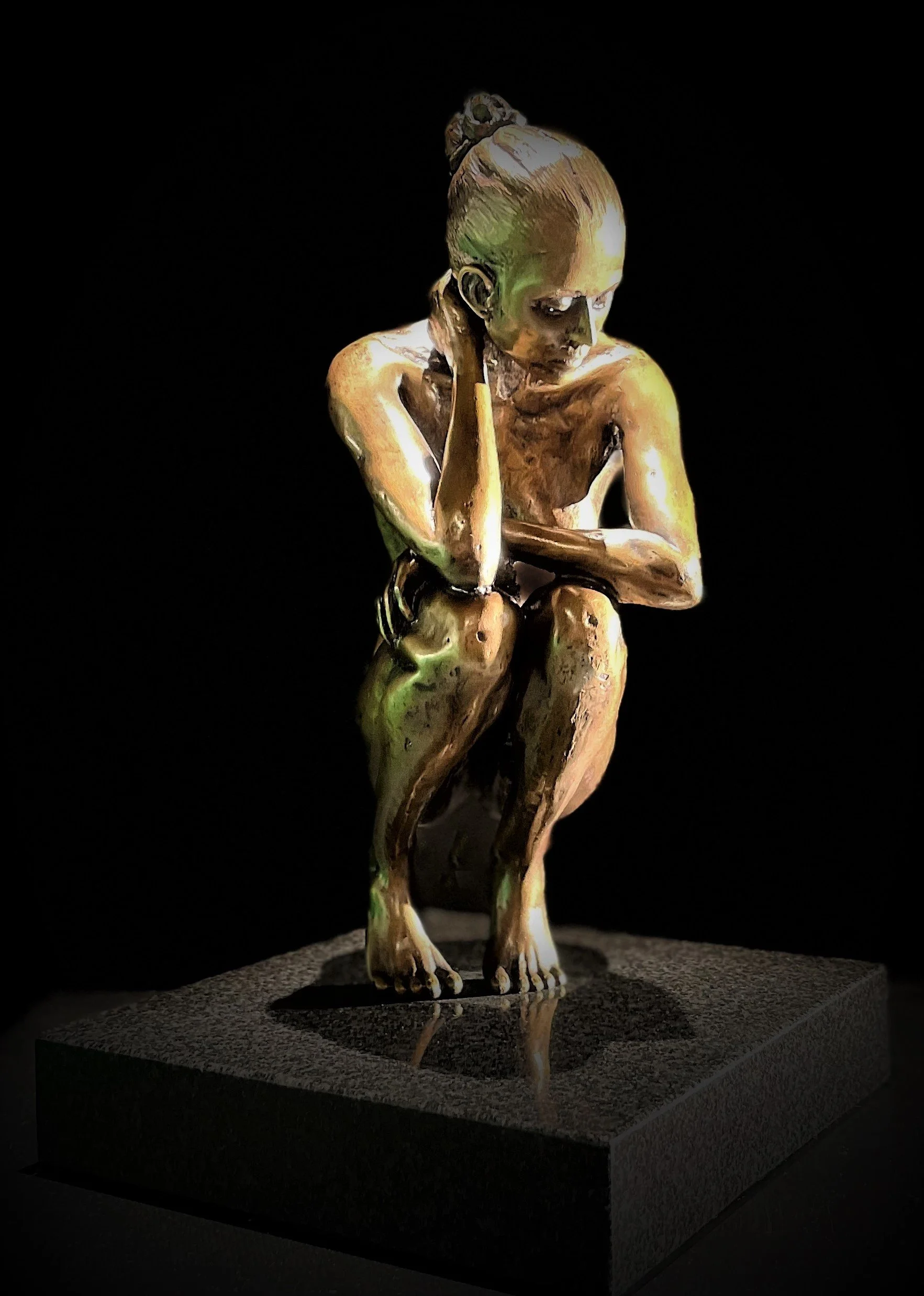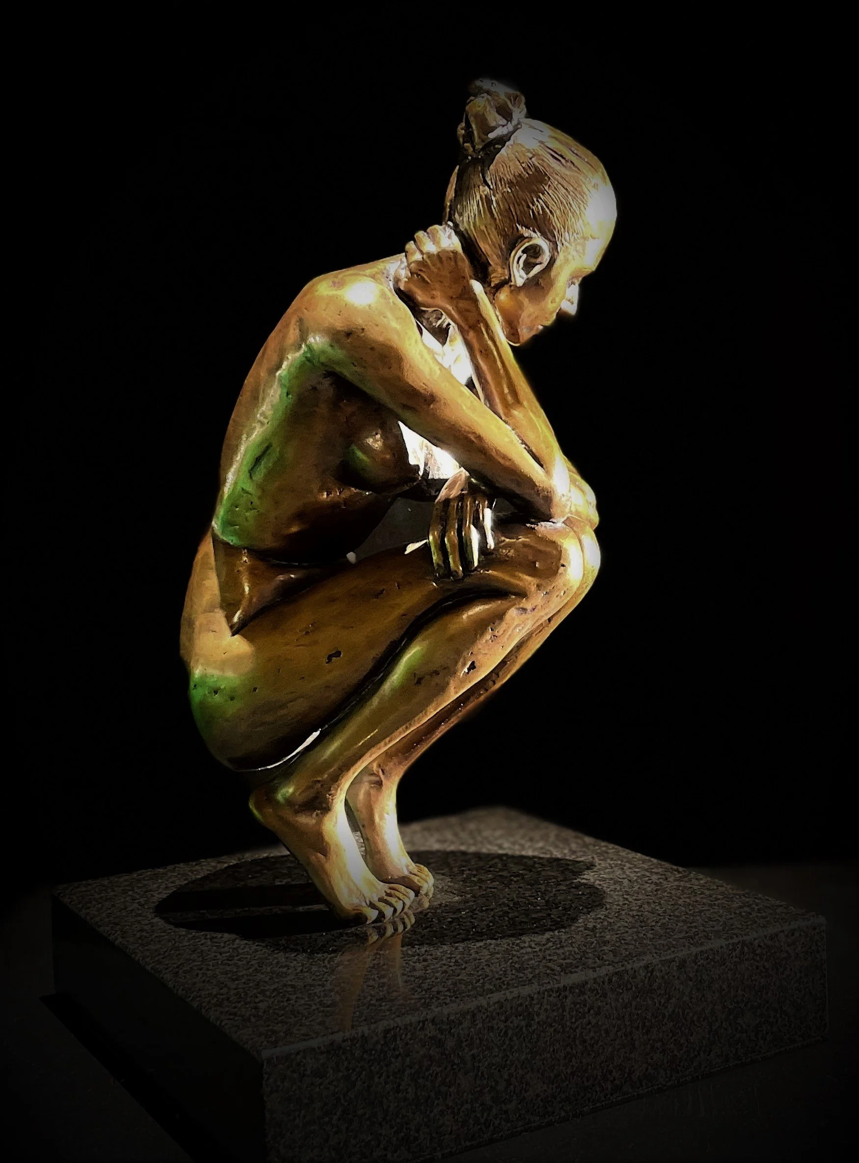 This piece was inspired by my daughter (as with many of my sculptures) and her move to Brooklyn, NY. The sculpture was first displayed in a gallery in Coeur d’Alene and was installed in a 4’, brighly lit cube with the front face of the cube open to the viewer. The intention was to give a sense of infinite space around the small sculpture. Opposite of this, was another installation of the same sculpture but in a very small box to symoblize claustrophobia.