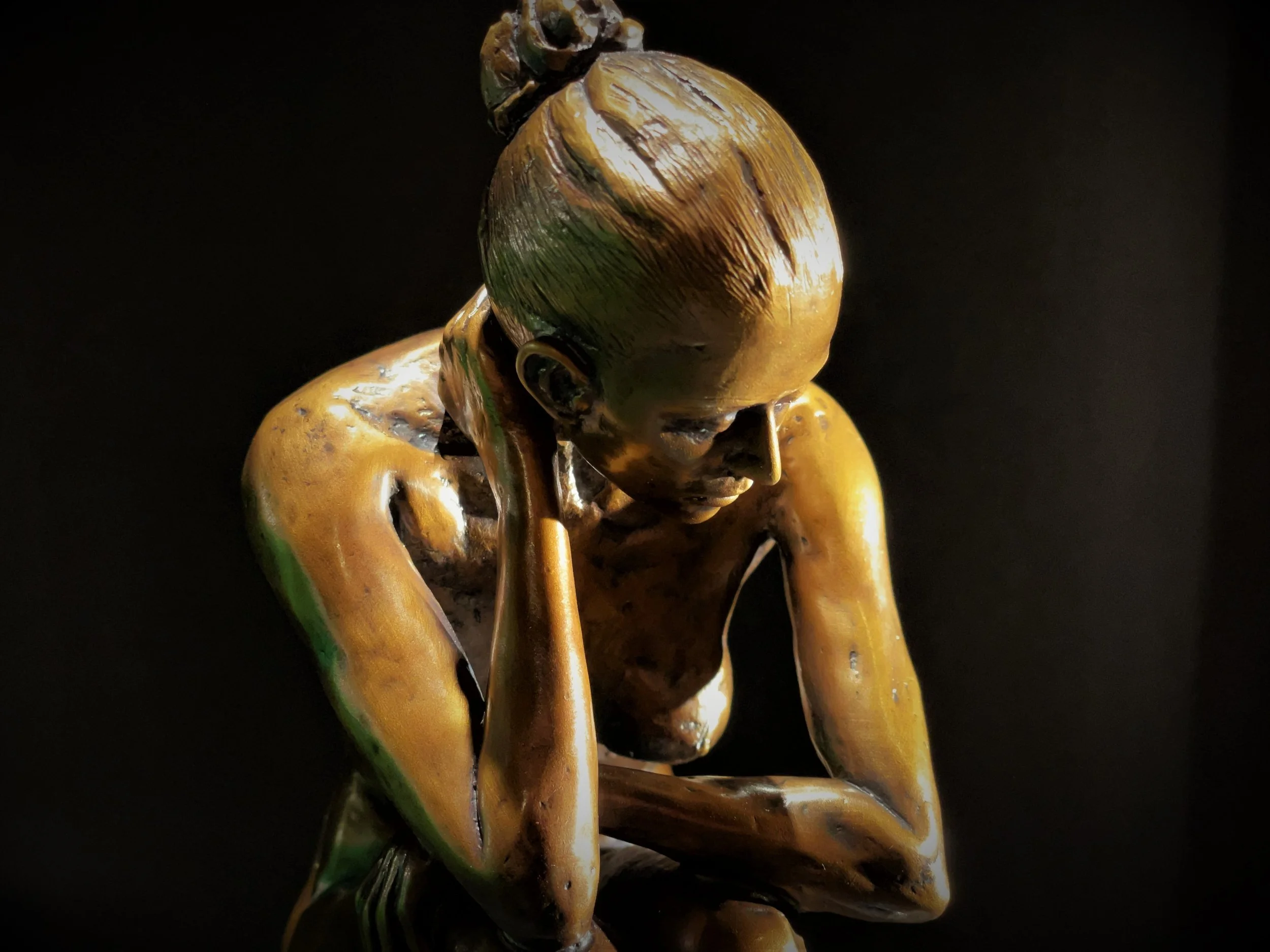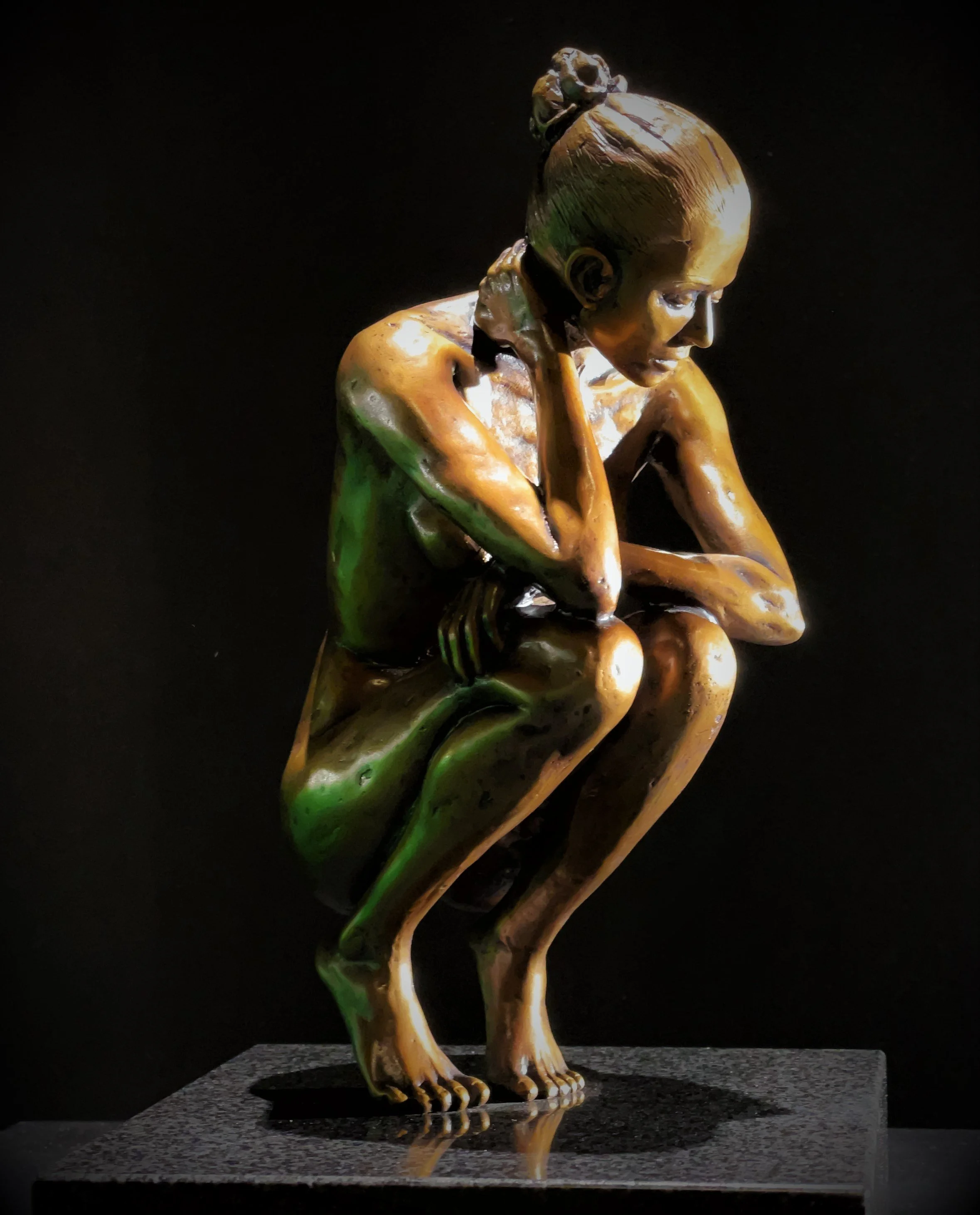I selected the position of the hand on the back of her neck and the slight in-turned position of her right foot to express a sense of anxiety or lonliness or uneasiness or timidity.