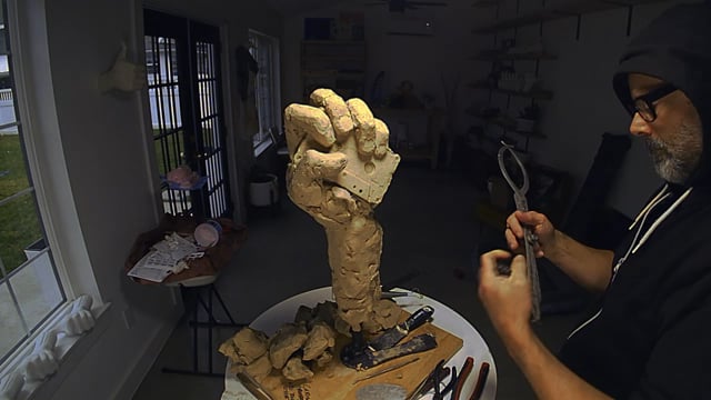 As with all my projects, this one came with a lesson. I arrived at my studio one morning after I completed the sculpture to find the top of the hand, broken along the top of wrist, laying on the table adjacent to the armature and board. Not as terrible to repair as you might think. A new threaded rod inserted through the wrist and bent up into the hand did the trick.